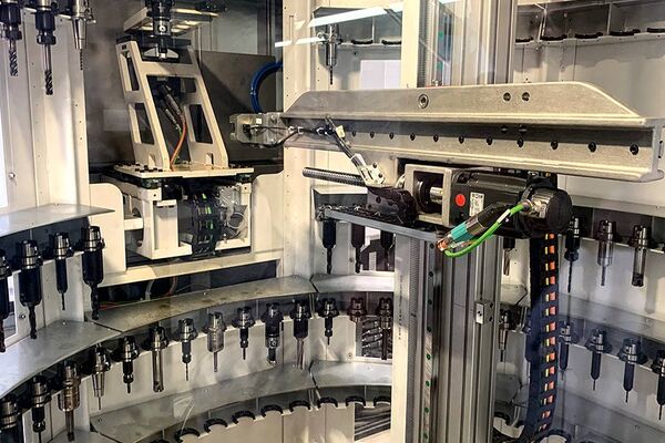 Das 5-Achsen-BAZ Acura EL von Hedelius wurde mit einem 22 Paletten Multi-Palettenspeicher ergänzt. Einzelteile als Wiederholteile oder kleine bis mittlere Serien lassen sich damit wirtschaftlich fertigen.