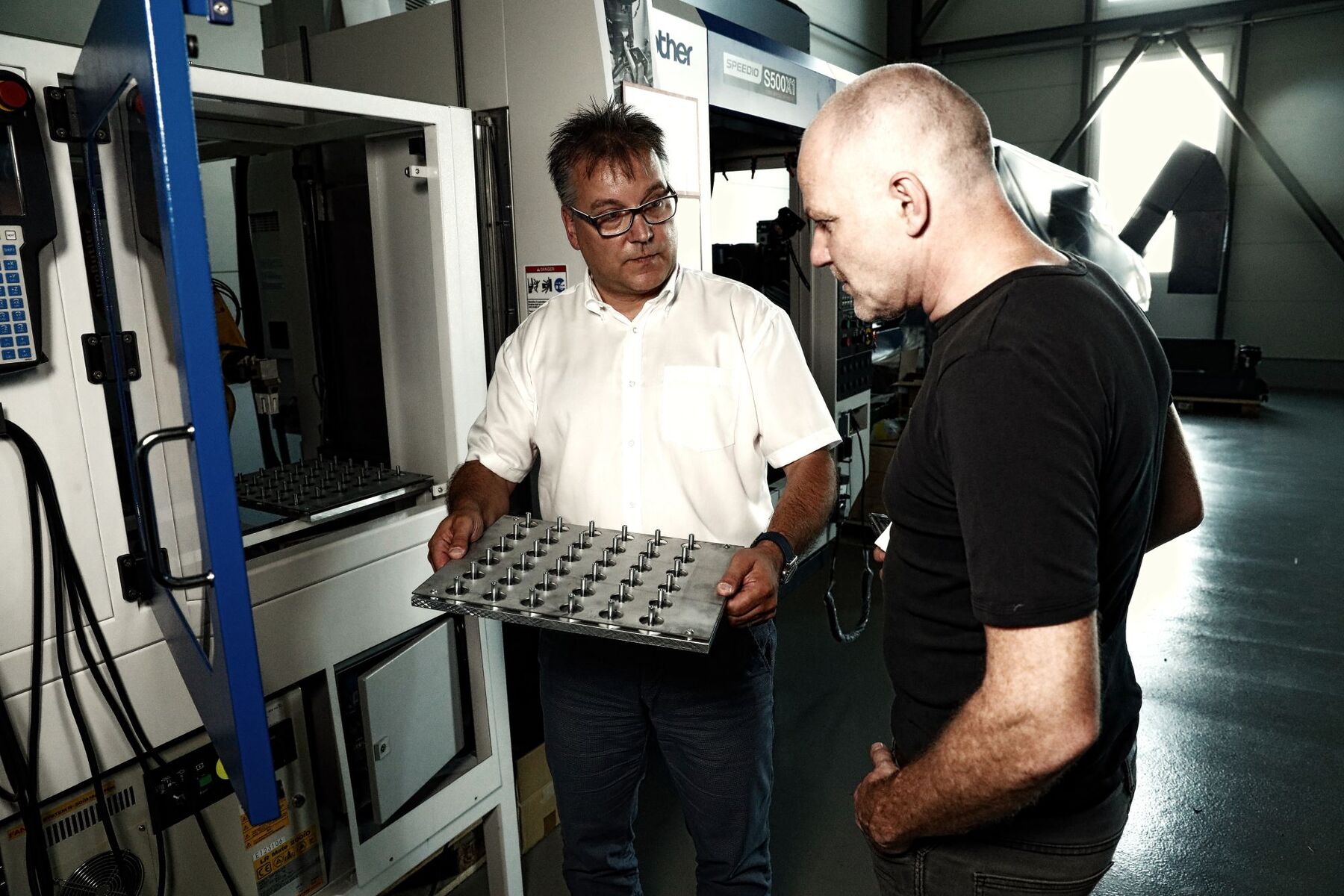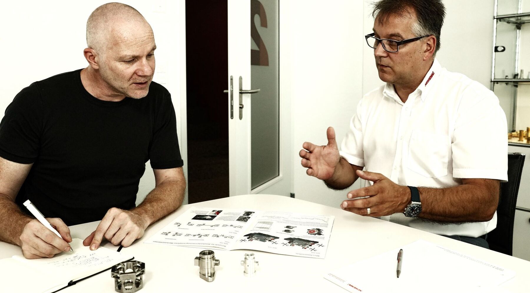 «Der Einsatz einer oder mehrerer solcher Maschinen kann durchaus einhergehen mit der grossen Frage, wohin eine Firma in zwei bis fünf Jahren möchte», sagt dort Rolf Jauch, Verkaufsleiter bei Newemag | Schneider mc (rechts) im Gespräch mit TuW-Chefredaktor Eugen Albisser.