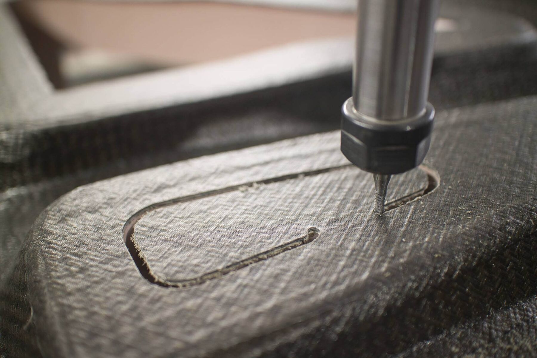 Germa stellt aus Naturfasern vor allem Karosseriebauteile her. Bei diesen sogenannten Aussenhautteilen (Exterieur) ist ausser der präzisen Bearbeitung vor allem das Aussehen gefragt. «Wichtig sind für uns saubere Schnittkanten und qualitativ hochwertige Oberflächen», erläutert der Geschäftsführer. «Wir setzen dazu Spezialfräswerkzeuge ein, die aber nur mit hohen Drehzahlen optimale Ergebnisse liefern. Aktuell erzielen wir auf der HG Grimme-Maschine bei Drehzahlen von 15‘000 bis 25‘000 Umdrehungen pro Minute sehr gute Schnittkanten und Oberflächen.» Die Gantry-Maschine bietet bei einer Maximalspindeldrehzahl von 40‘000 min-1 und einem Vorschubtempo von 80 m/min. genügend dynamische Reserven.