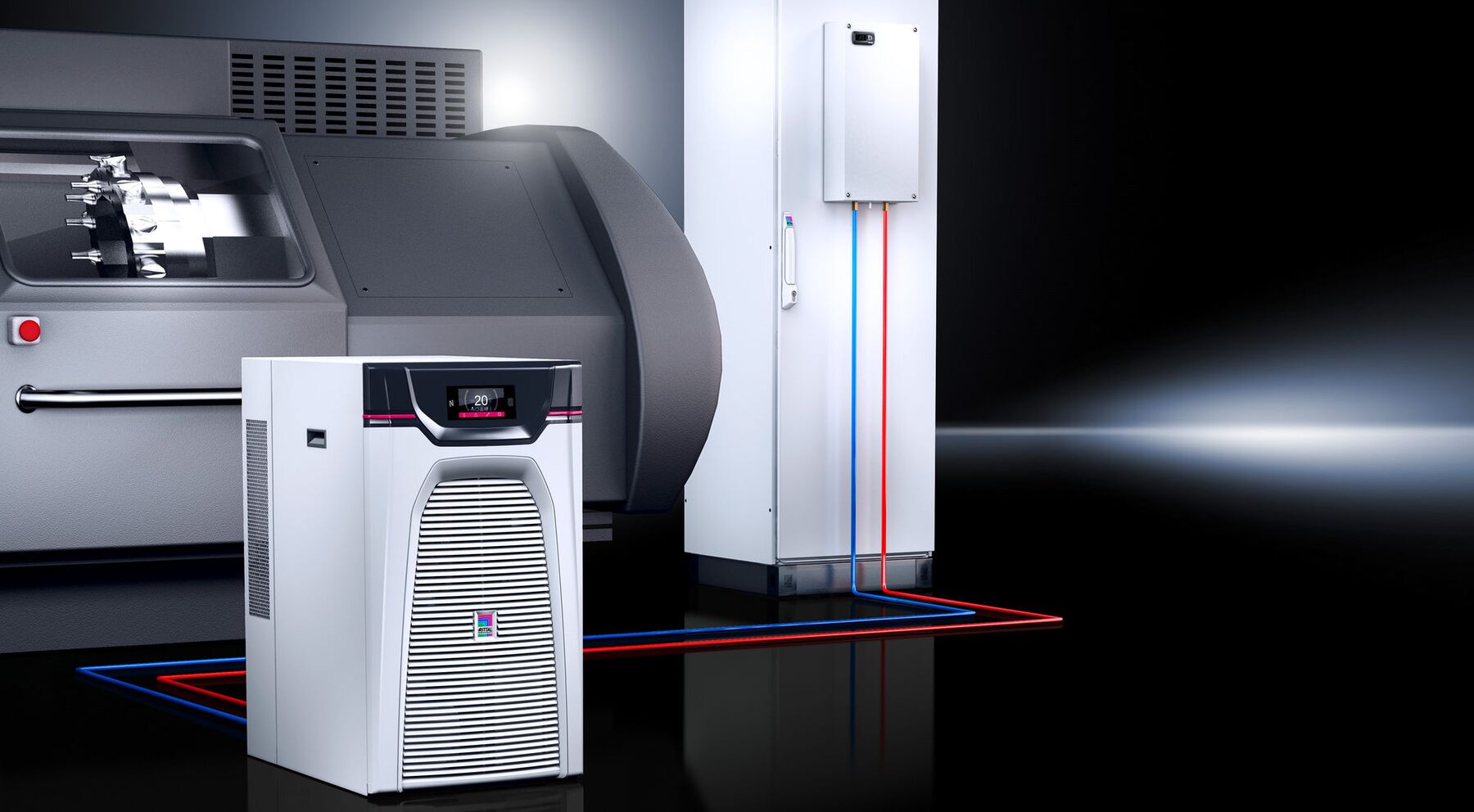 Im Chiller erzeugt ein über einen Inverter geregelter DC-Kompressor die notwendige Kälteleistung. Ein Kreislauf transportiert das Kühlmedium dann zum Verbraucher, etwa zu den Spindeln. Um den Schaltschrank der Werkzeugmaschine ebenfalls effizient zu klimatisieren, wurde das vorhandene Kompressorkühlgerät durch ein Gerät aus der Serie Blue e+ von Rittal ersetzt.