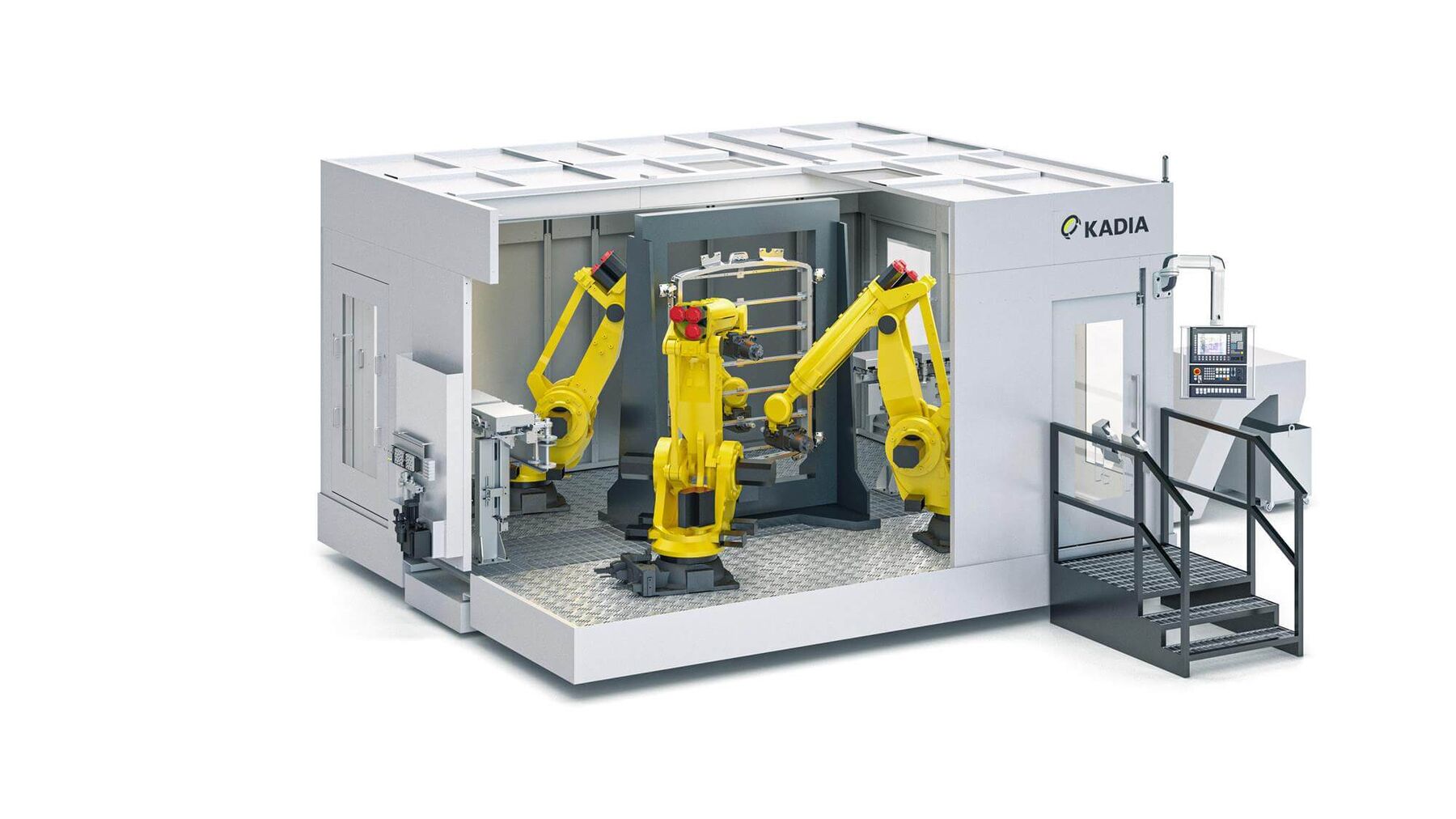 Kernstück der Entwicklung bei Kadia ist eine fünf mal sechs Meter grosse Versuchszelle mit einem Sechs-Achs-Industrieroboter und einer Schnellwechseleinheit. Hier kann der Prozess der späteren Anlage bereits getestet werden. Vorversuche ermitteln die optimalen Schnittdaten und prüfen die Stabilität. In der Zelle befinden sich 15 einwechselbare Einheiten. Auf neun davon hat der Roboter einen automatisierten Zugriff mit einem Aktionsradius von 2,70 m. Eine Einheit stellt eine bestimmte Funktion dar, die für die Bearbeitung eines Bauteils gebraucht wird. Typischerweise besteht sie aus einer Motorspindel mit Schnittstelle und einem Zerspanungswerkzeug.