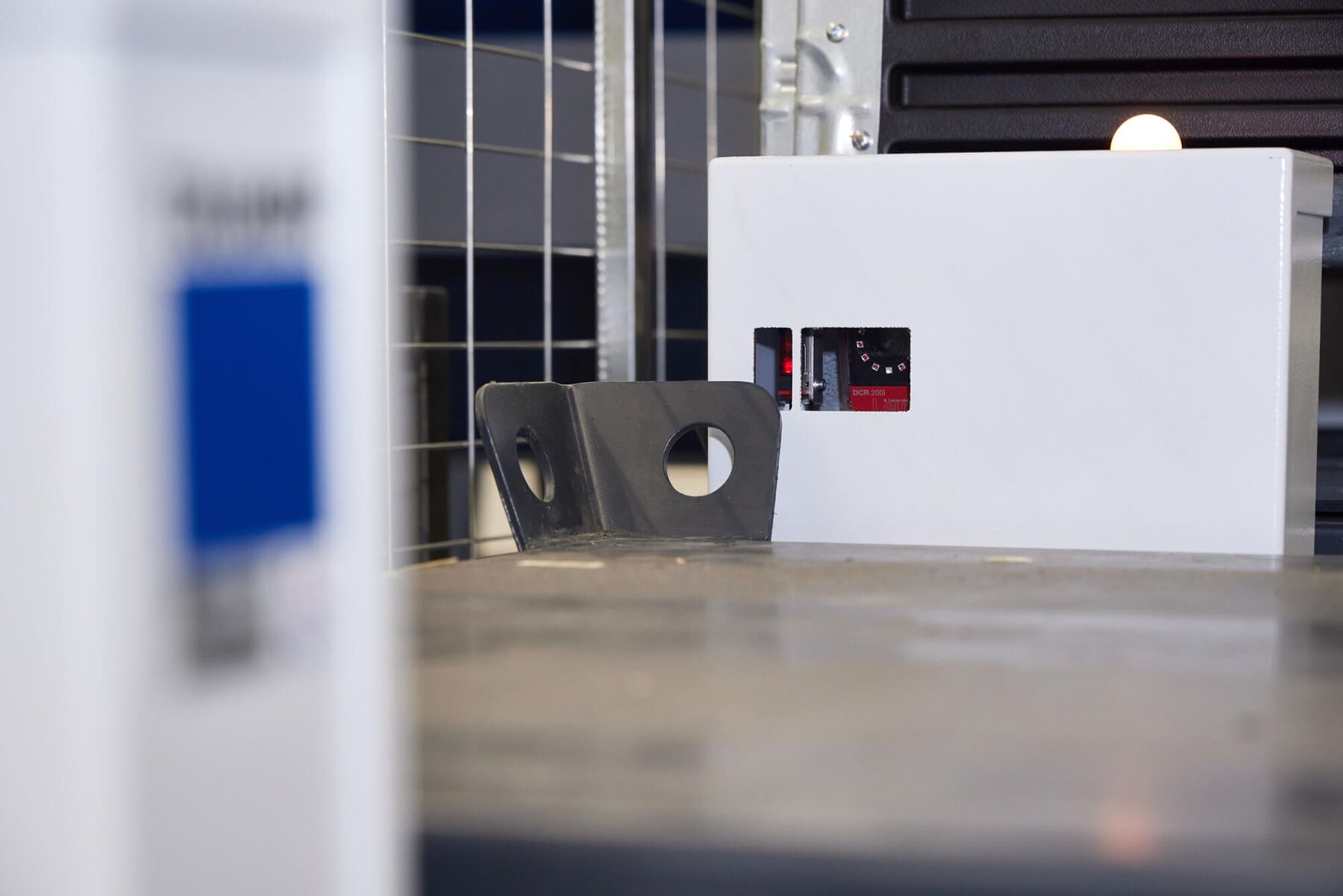 Für den Betrieb der Docking-Station sowie zur Übertragung von Daten ins System kommen Leuze Sensoren zum Einsatz. An einer Docking-Station sind dies in der Regel drei Stück: Ein Sensor HT5.1/4X ist unten an der Station installiert. Er erfasst die Anwesenheit eines Wagens. Ein weiterer Sensor dieses Typs befindet sich oben an der Docking-Station. Dessen Aufgabe ist es, die Anwesenheit von Paletten zu registrieren. Ist eine Palette erkannt, startet der HT5.1/4X deren Identifikation über einen weiteren Sensor. Hierfür ist ein DCR202iC installiert: Der Scanner erfasst über den auf der Palette abgebildeten 2D-Code Auftrags- und Materialdaten und übergibt sie ans Transportleitsystem.