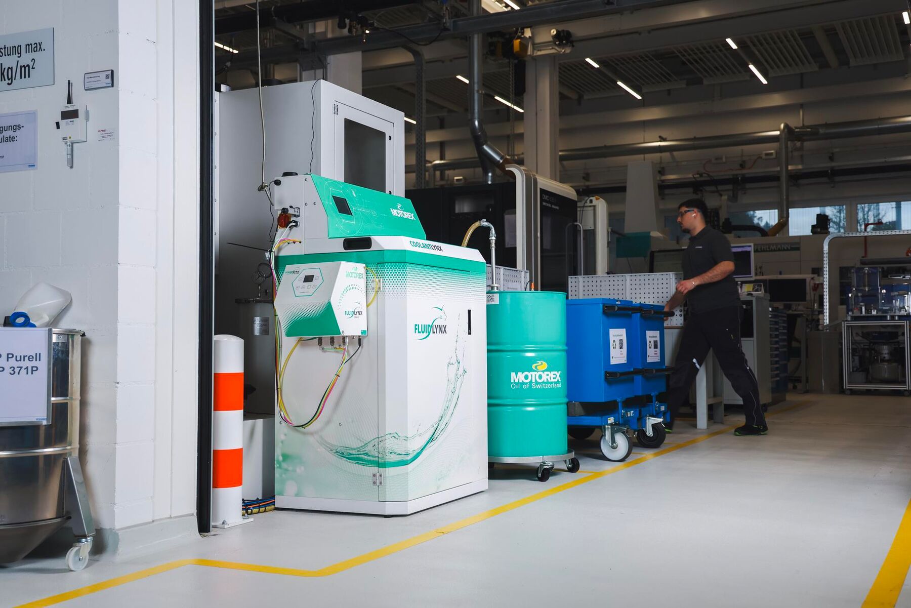 Digitalisierung ist der Wegbereiter für eine nachhaltige Produktion. Smarte Software überwacht dafür sämtliche Prozesse in Echtzeit, synchronisiert und analysiert Daten. Fluidlynx von Motorex geht dabei noch einen Schritt weiter. Das System regelt und steuert sich selbst. Martin Held konnte seine Mitarbeiter und Vorgesetzte deshalb rasch überzeugen, dieses System zu installieren. In einem ersten Schritt wurden zwei Coolant Boxen angeschafft und fünf bzw. sechs Maschinen daran angeschlossen.