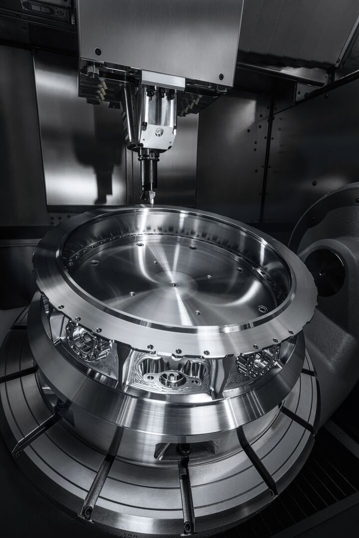 Gleichzeitig sind aber auch die Vorteile vieler Achsen mit 12 rotierenden Werkzeugen im Revolver und der simultan in 5 Achsen interpolierenden Fräsbearbeitung mit bis zu 72 Werkzeugen nutzbar. Das Entwicklerteam von Spinner hat es damit geschafft, die modernen Anforderungen an die Komplettbearbeitung zu bedienen und gleichzeitig durch Reduktion auf ein Minimum an Komplexität die eigenen Ansprüche hinsichtlich der Fertigungstoleranz deutlich unter 1 µm zu erfüllen.