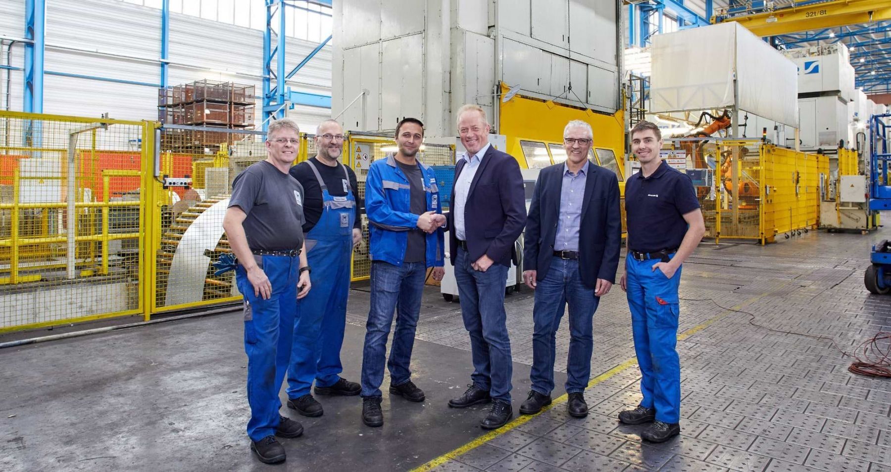 Hintergrundbild: Das Team aus Mitarbeitern von Meleghy Automotive und Schuler.